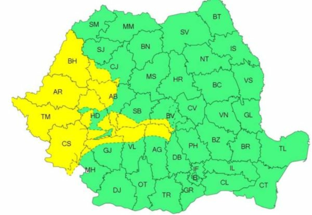 Potrivit meteorologilor, în intervalul 23 octombrie, ora 21:00 – 24 octombrie, ora 10:00, va fi în vigoare un Cod galben în Banat și Crișana, unde vântul va avea intensificări temporare cu viteze de 50 – 70 km/h. În Carpații Occidentali și în cea mai mare parte a Carpaților Meridionali vor fi intensificări ale vântului cu viteze de 70 – 90 km/h, iar la peste 1.700 de metri vor fi rafale de 90 – 110 km/h.